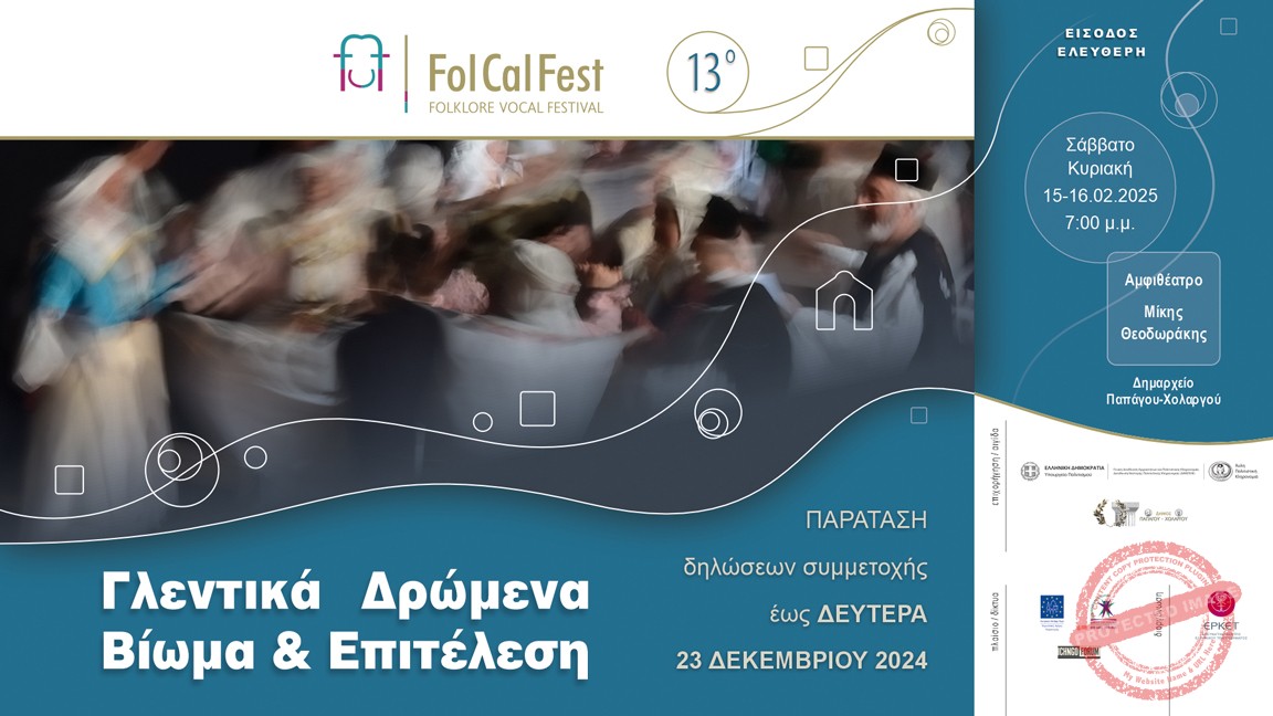 Το Δ.Σ. του Ερευνητικού Κέντρου Ελληνικού Τραγουδήματος [ΕΡ.Κ.Ε.Τ.] και η καλλιτεχνική επιτροπή του FolCalFest ανακοινώνουν τη διοργάνωση του “13ου FolCalFest | Γλεντικά Δρώμενα: Βίωμα & Επιτέλεση” στον Χολαργό. Το φεστιβάλ θα πραγματοποιηθεί το Σάββατο και την Κυριακή 15-16 Φεβρουαρίου 2025, και ώρα 7:00 μ.μ., στο Αμφιθέατρο “Μίκης Θεοδωράκης” στο Δημαρχείο Παπάγου-Χολαργού. Η υποβολή συμμετοχών θα είναι ανοικτή έως και τη Δευτέρα 25 Νοεμβρίου 2024.